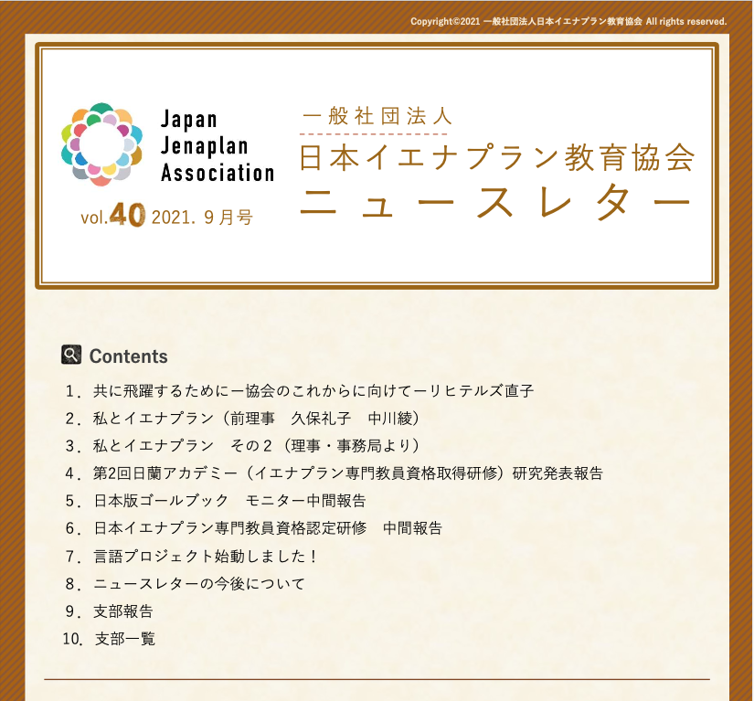 今年の4月より開始いたしましたニュースレターバックナンバー公開、その第3弾として、2017年2月〜2021年9月(No.031〜No.040)のニュースレターを公開いたしました! 日本イエナプ...