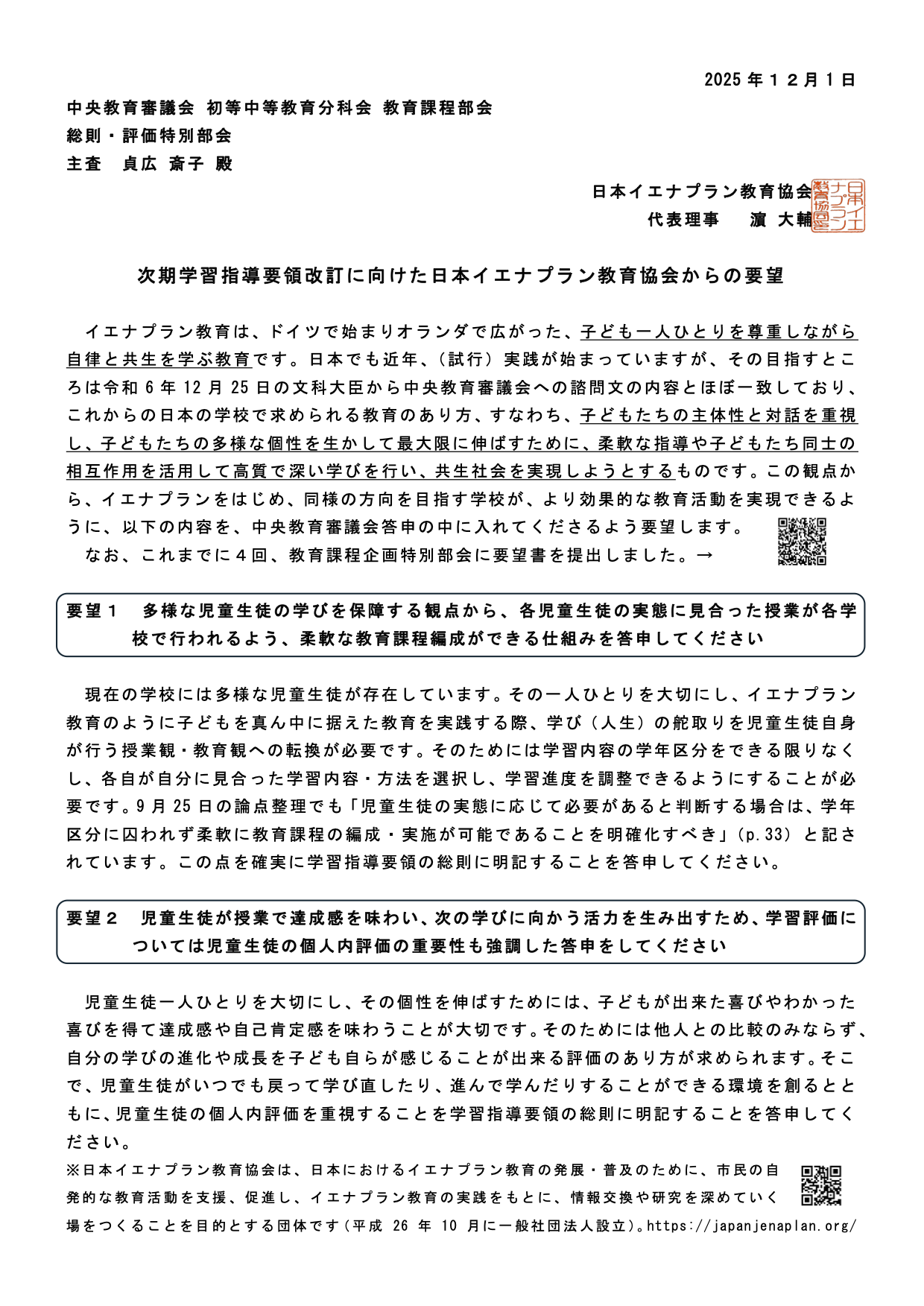 日本イエナプラン教育協会では、イエナプラン教育の意義や重要性を、文部科学省の中央教育審議会で次の学習指導要領のあり方を検討している委員の皆さんに知ってもらうため、2025年5月〜7月に4回にわたって...