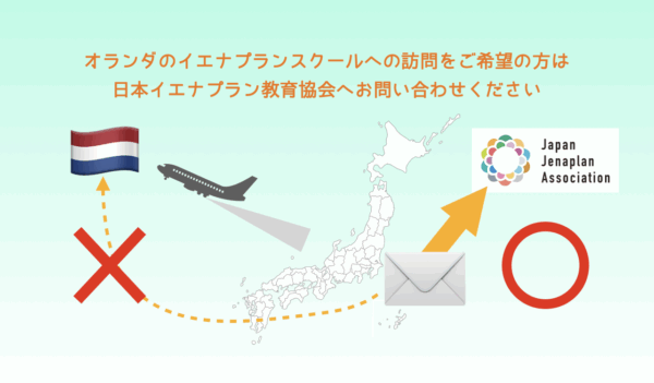 つきましては、オランダのイエナプランスクール訪問については、当協会でも定期的に企画しておりますので、そちらをぜひご利用ください。また、その他の企画等をお考えの方は、当協会にご連絡いただけるようお願いいたします。これらに関しまして、オランダの協会や各学校への直接の相談はくれぐれもお控えください。